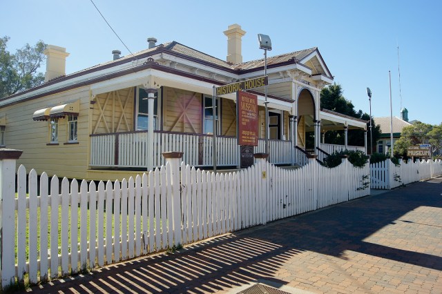I declined, and continued to sticky-beak my way through the dozen rooms – including a bedroom with some amazing 1920’s women’s fashion on a few mannequins, and a period piece bed. The dining room (this building was the original bank, and held the council chambers) was crammed but spectacular, while the stables (filled with old carts) and garage were fascinating. Especially the rail – ambulance.