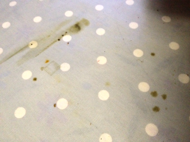 The smear on the left had formed after I had sat the typewriter back down post spraying along the ‘comb’ The drizzle of dirty dots to the right formed under the segment – beneath the experimental group. Other drops came from other lubricated locations.